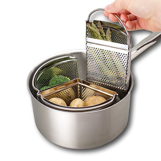 Sometimes it's the simplest ideas which are the best! This saucepan divider set allows you to divide a standard 20cm/ 8" saucepan into three sections so that you can boil or heat 3 different types of food at the same time. Each section is easily removable so that you can get the timing just right, whatever it is that you're preparing. As you can drain straight into the saucepan, there's no need for a colander either!