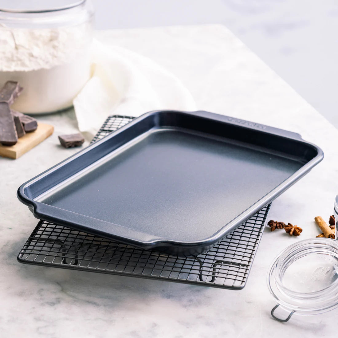 GreenPan bakeware takes our expertise in PFAS-free non-stick coatings from the hob to the oven! This collection of sturdy metal baking pans is your partner for worry-free baking. The high quality metal ensures the bakeware lasts a long time, without warping. Perfect for your favourite sweet dessert or a savoury casserole. After use, you can clean them in no time. All items except the springform and muffin moulds are also dishwasher-safe.