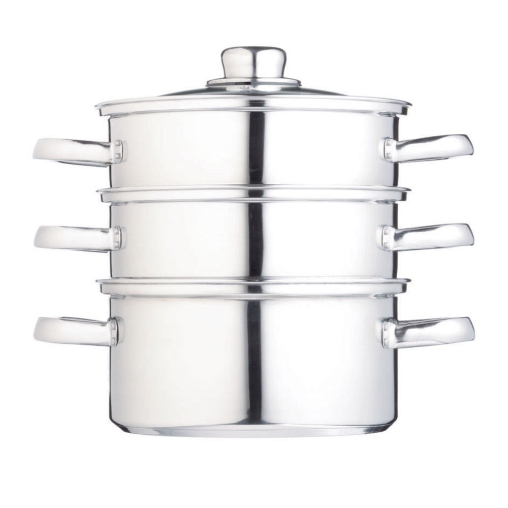The Clearview three-tier stainless steel steamer from Kitchen Craft is an essential item in cooking and promoting a healthy diet and lifestyle. Steaming helps retain vitamins, minerals, flavour, colour, and texture in food, often lost when boiling. The three tier system allows complete flexibility for cooking various foods simultaneously, as you can cook three different foods at the same time. Or simply start with one tier, then add another, and then another, for phasing different cooking times according to the food type or recipe. Featuring a vented glass lid (so you can always see what you're doing!), wide riveted side handles, and high quality mirror polished stainless steel interior and exterior, the steamer is an easy and simple item to use in everyday cooking. Suitable for use on all types of hobs including induction. it's dishwasher safe and has a fifteen year manufacturer's guarantee.