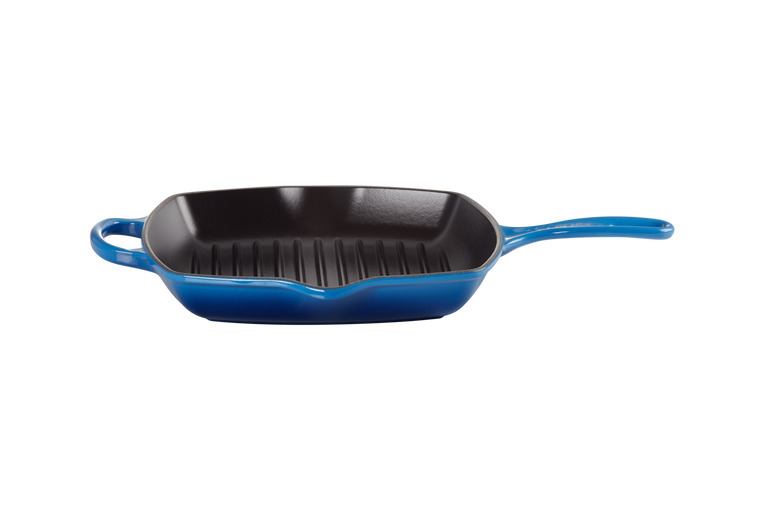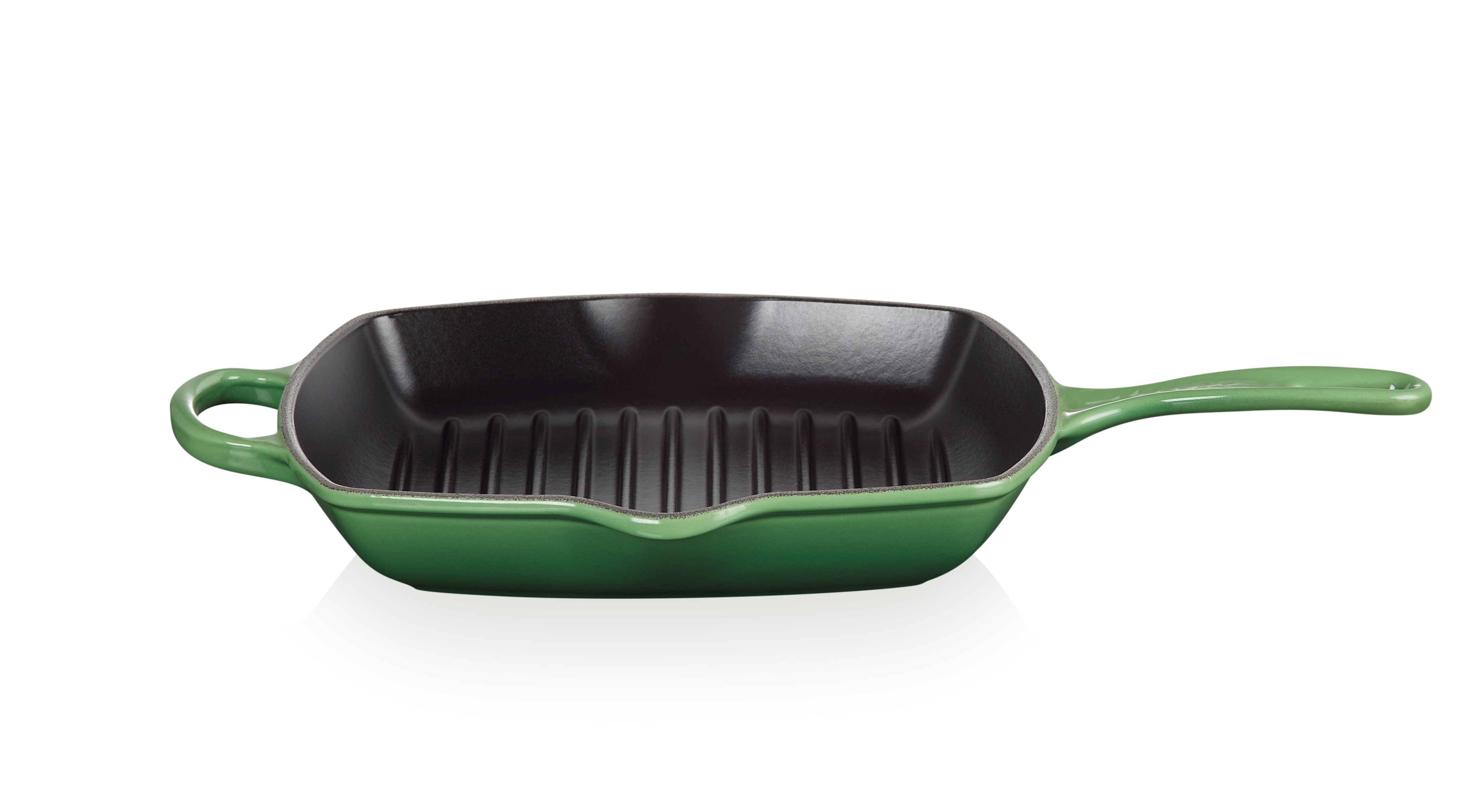 As cast iron can reach high heat on a low to medium setting, you can seal your food quickly and lock in the moisture, nutrients and flavours, producing succulent tasty meals. It is a very healthy way of cooking too as the cooking fat drains away and collects below the ribs.The new helper handle sets this new Signature Square Grillit® apart from others, for extra ease of use and stability when lifting a full pan. The grill is coated with Le Creuset’s specialist satin black enamel finish. Durable and easy to clean, the satin black enamel interior has been especially designed to protect the pan (no seasoning is required) and is ideal for searing and grilling foods such as meat, fish and vegetables.