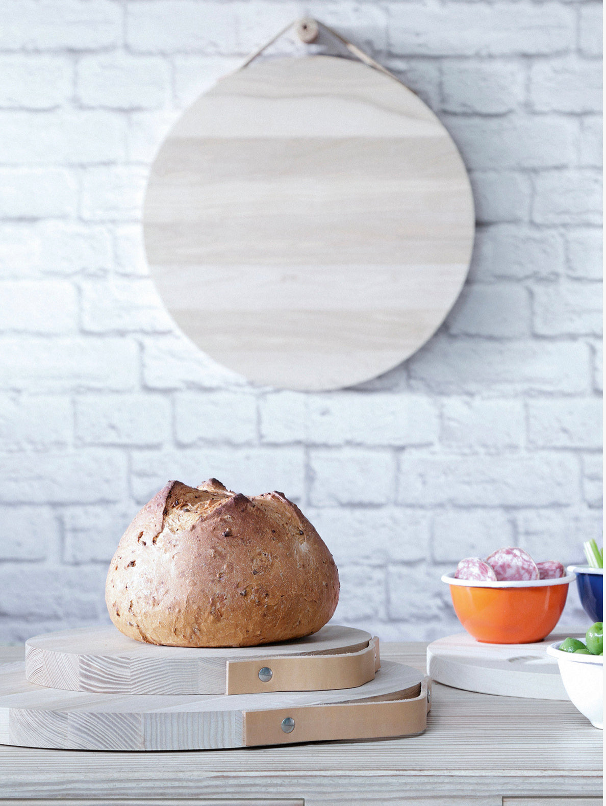 A small, solid wooden board made from sustainably-sourced ash. Finished with a thick, leather strap handle. Designed for chopping and serving bread, cheese and charcuterie. Treat with food safe oils or leave to mature and colour naturally.