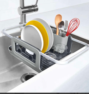 It’s constructed from durable aluminum that will never rust. Extend the Rack’s arms to fit over different sink sizes and drain your dishes directly into the sink to save space and stay tidy. The arms can also be retracted to use the Rack inside the sink or on a drying mat on the countertop. The unique plate holders keep dishes and bowls upright, and the divided utensil cup is removable for convenient unloading.