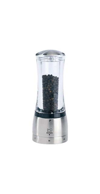 Daman – with its pure plain lines and transparent acrylic, this mill reveals all! The central shaft has been removed, so nothing detracts from its style. Its reservoir appetisingly displays the salt crystals or peppercorns within.