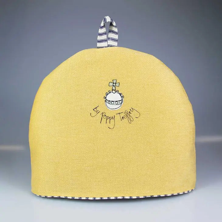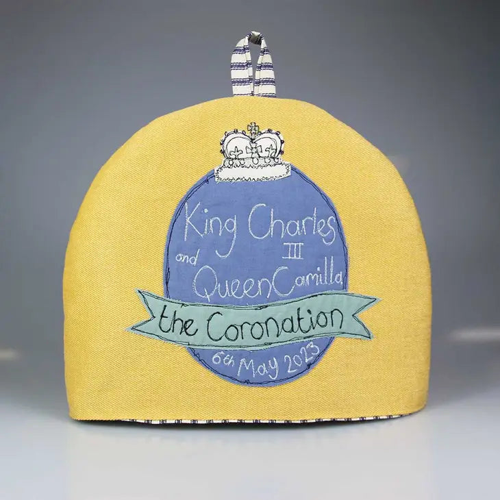 After the Jubilee, we thought it was only the right thing to create a Coronation tea cosy to celebrate the big occasion. Our tea cosies are individually stitched with care and attention by our small team in Cornwall. Product info Size approx in cm: 25 (h) x 30(d) (Fits a standard teapot). Material: Outer made from Heavy brushed gold cotton drill, lining made from blue traditional ticking. Padded with polyester wadding. Design detail: Applique and freehand machine embroidery on front. Orb on back. Blue ticking hanging loop.