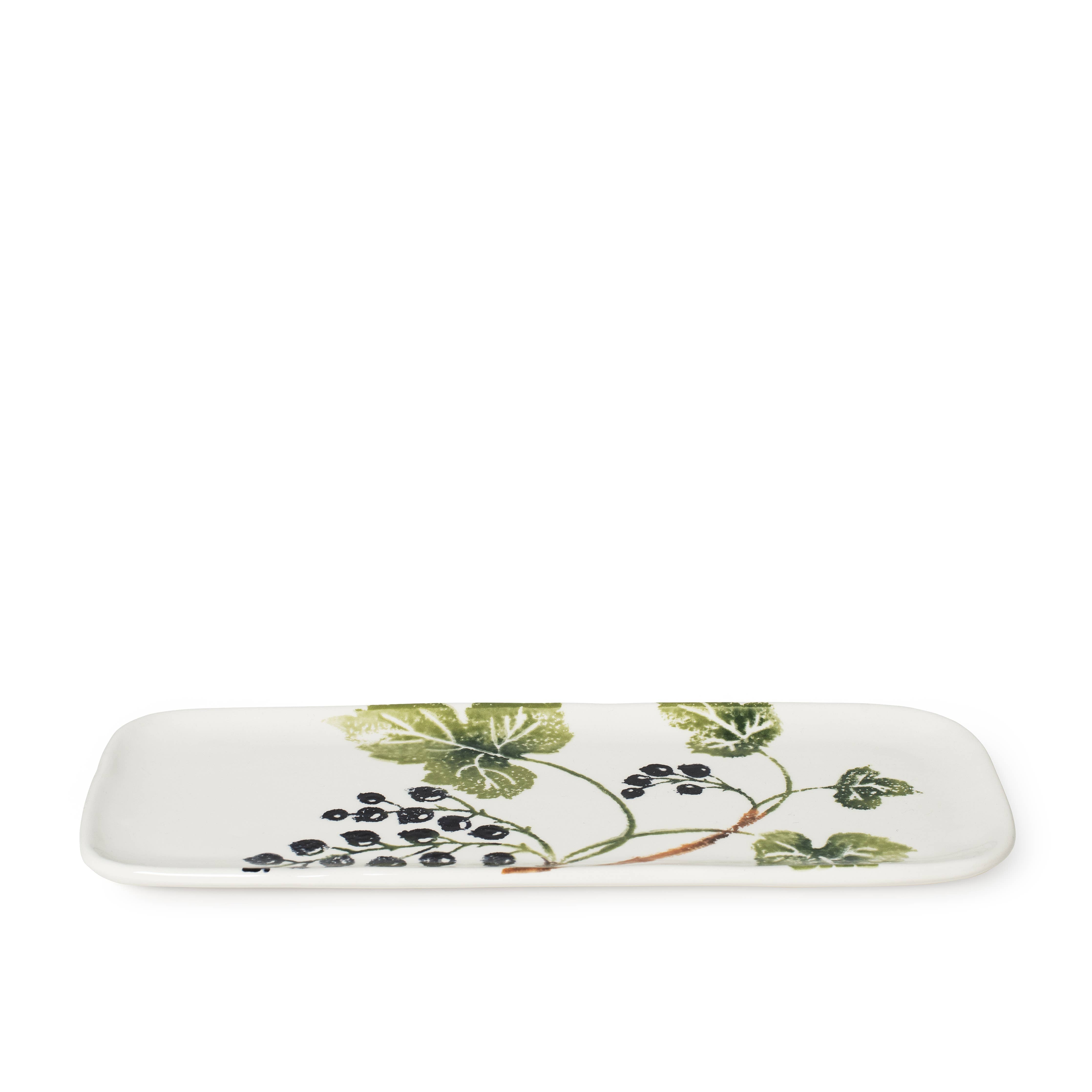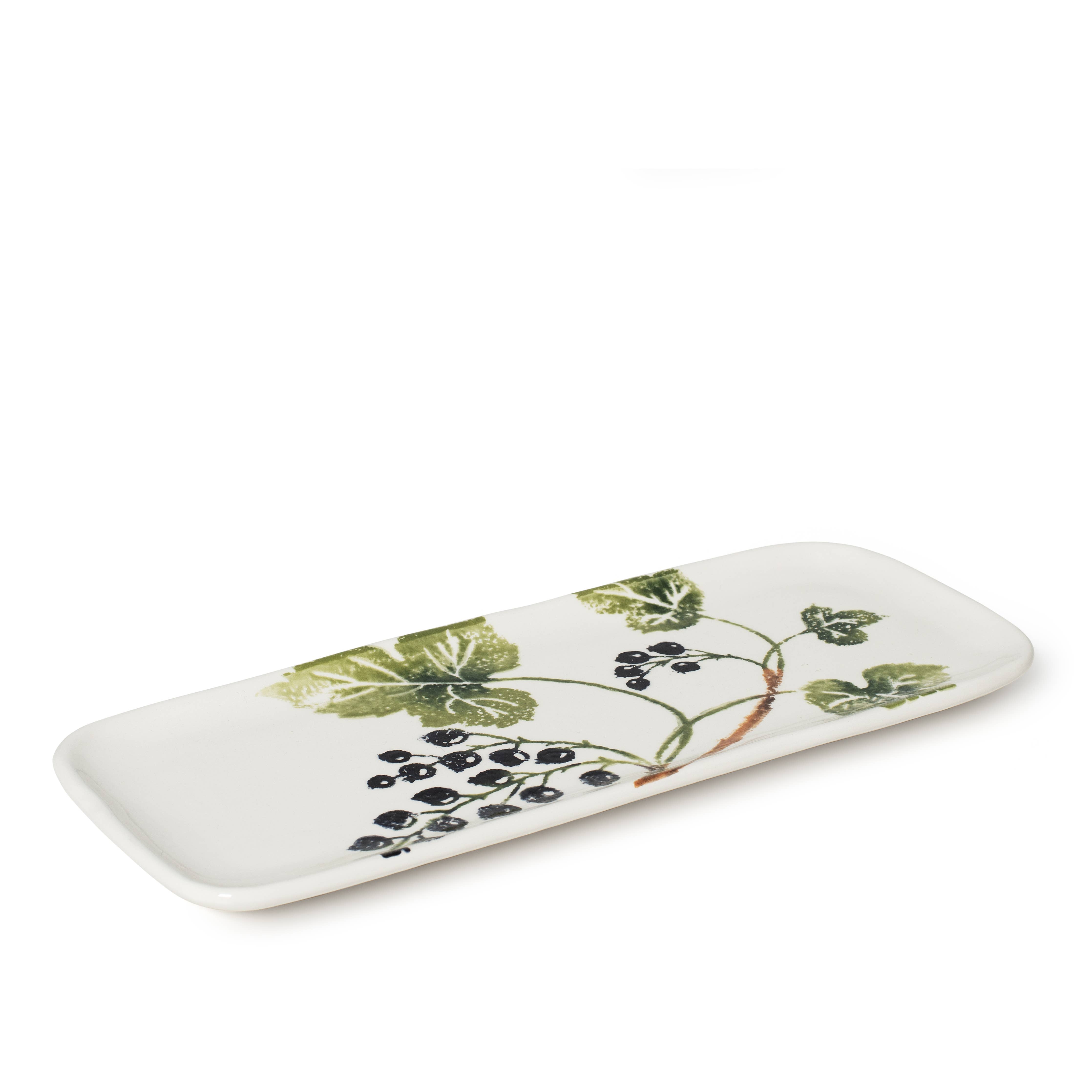 This small tray features artwork of the blackcurrant bush and has been applied with sponges by artisans at a small, family-owned factory in Italy that has handed down techniques through the generations, focusing on creating stunning and unique pieces of functional artwork. The tableware collection also includes serveware, bowls and plates manufactured from earthenware clay. Material: Earthenware Dimensions: 28cm x 11cm x1 Care Instructions:Handwash only