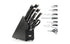 Contains 7cm Peeling Knife, 9cm Paring Knife, 20cm Bread Knife, 23cm Sharpening Steel, 16cm Utility Knife, 20cm Cooks Knife, Kitchen Shears and Empty 7-Slot Black Knife Block.